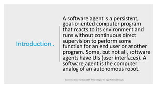 Facing the flood of information and increasing competitive environment, the eCommerce seller must make its software facility more customeroriented, more intelligent, and build onetoone marketing A new eCommerce model is presented to support consumer buying decision making Some new intelligent technologies like software agent, neural computing,Software agents are the useful tools to help individuals to undertake their activities on ECommerce surroundings Software agents create different paths for communication Software agents increase the effectiveness and efficiency in several levels of market processesSoftware Agents Intelligent Agents eCommerce BBA 6th Semester PRIME COLLEGE Nayabazar, Kathmandu 2 Motivations Increasingly networked, temporary connectivity increasing (wireless) Huge interconnection =>